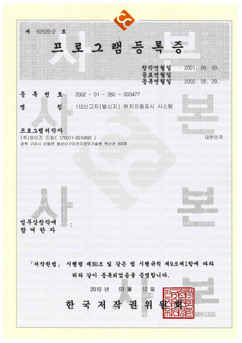 [프로그램등록증] 112신고자(발신자)위치자동표시시스템 페이지 정보 와이즈드림 작성일20-12-07 14:14 조회19,896회 관련링크 본문 112신고자(발신자)위치자동표시시스템 이전글 목록