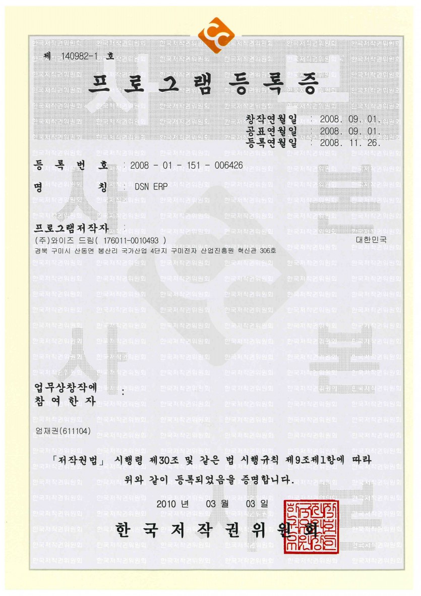 [프로그램등록증] 전사적 자원관리시스템 (DSN ERP) 페이지 정보 와이즈드림 작성일20-12-07 14:28 조회19,621회 관련링크 본문 전사적 자원관리시스템 (DSN ERP) 이전글 다음글 목록