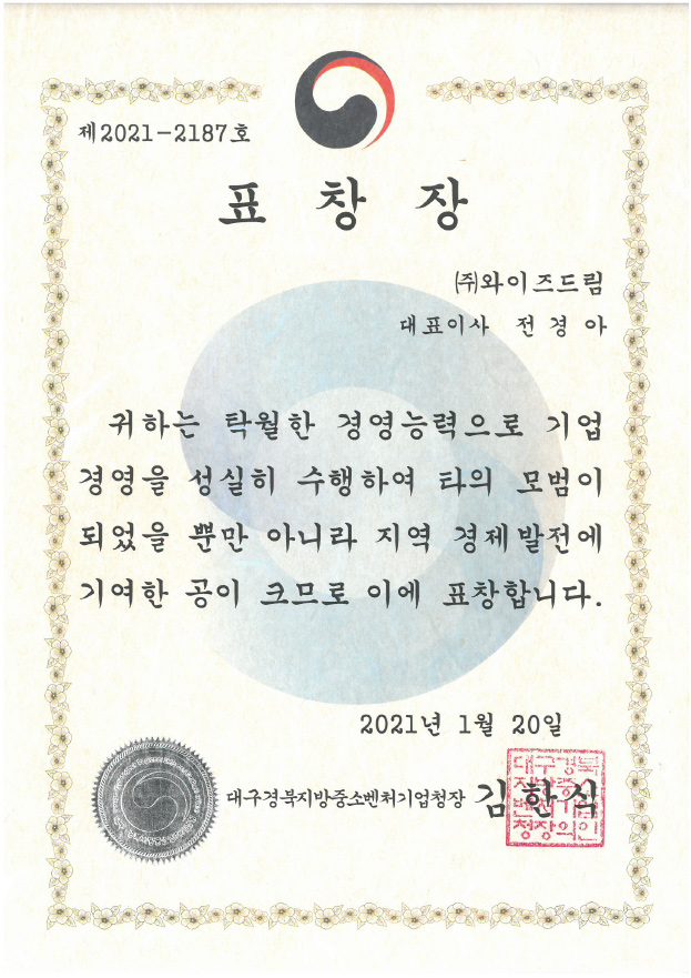 2021년 대구경북지방중소벤처기업청장 표창장 페이지 정보 와이즈드림 작성일21-01-28 10:44 조회5,748회 관련링크 본문 힘든 시기에도 임원분들의 노력으로 표창장을 수여하였습니다.열심히 노력하고, 건강한 와이즈드림이 되겠습니다.2021년 대구경북지방중소벤처기업청장 표창장 이전글 다음글 목록